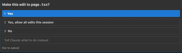 If you run a command not in the settings above, it'll still ask. Instead of hitting Yes every time, select option 2: "Yes, allow all edits this session". This auto-approves the same type of action for the rest of the session.