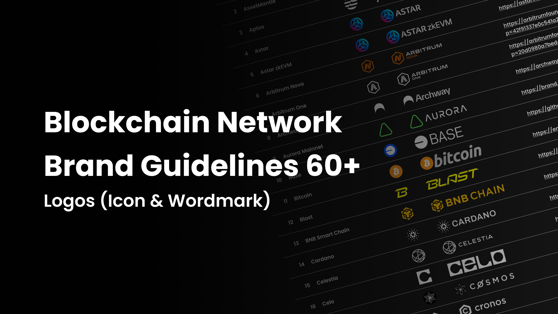 Brand kits for 66 popular blockchain networks organized alphabetically, including logos, symbols, currency info, chain type, and chain ID.
