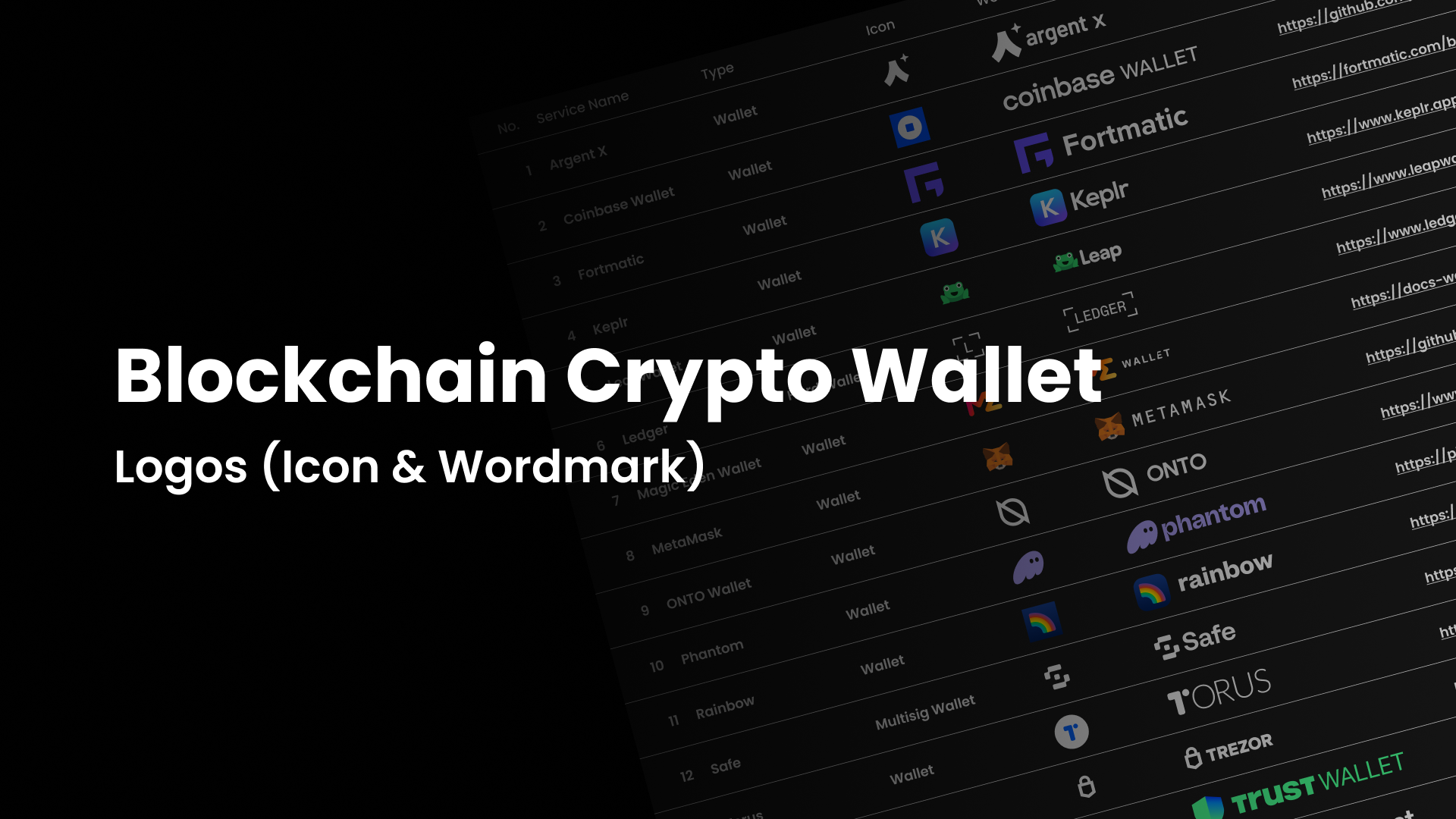 Icons, wordmarks, and brand kit URLs for 18 well-known crypto wallet services, each pointing to the official source.